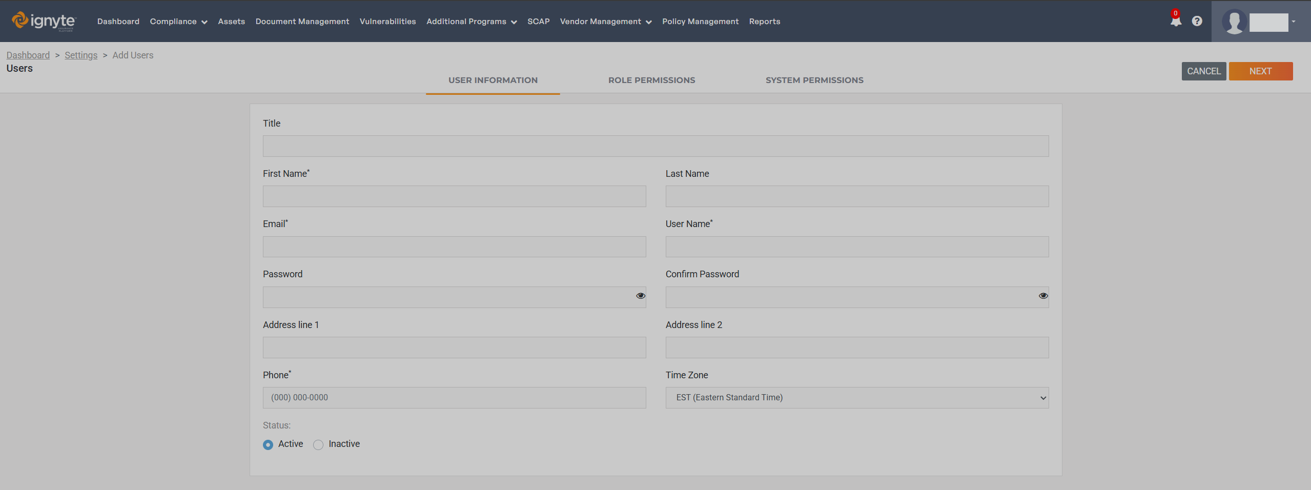 Users can be added by clicking the orange + ADD USER button in the top right corner under the user drop-down menu. This will display the page below: