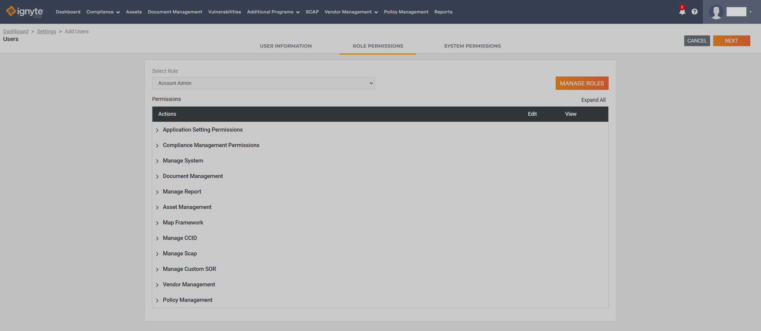 Once all required fields are completed, click Next to proceed to the Role Permissions tab.
